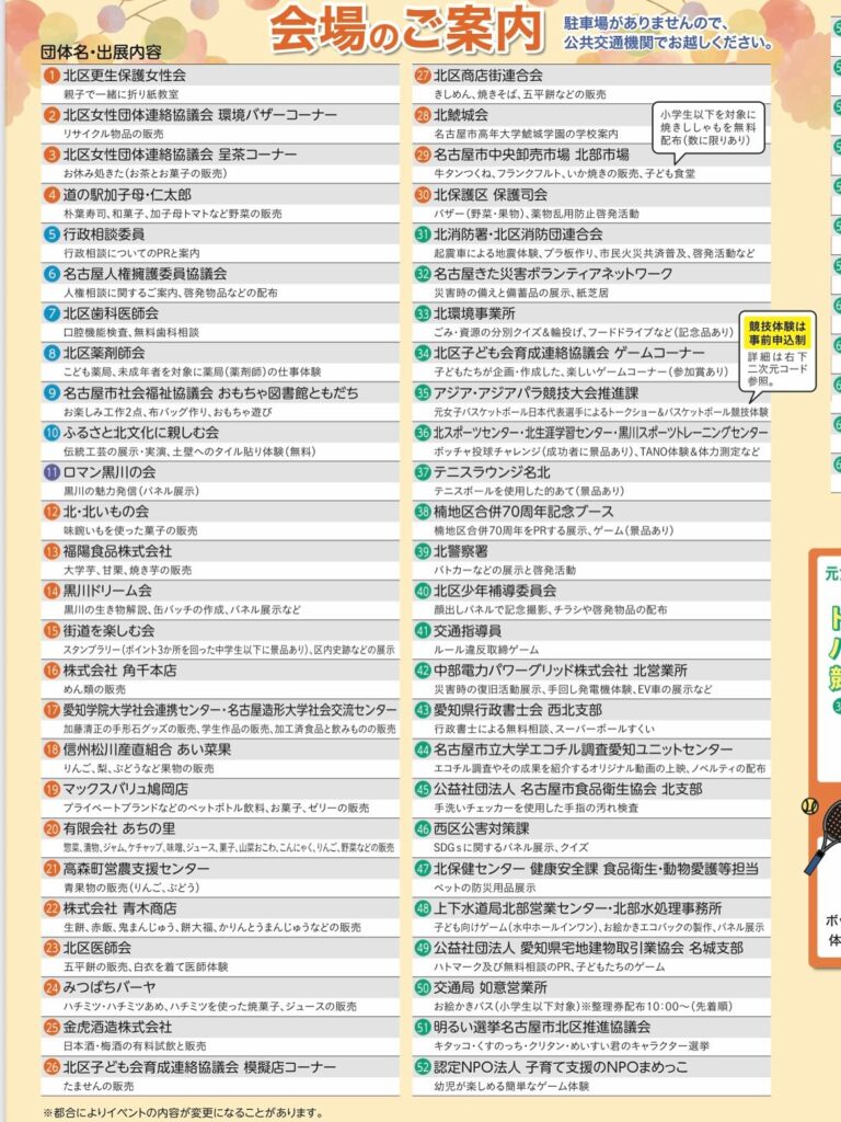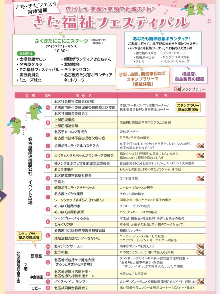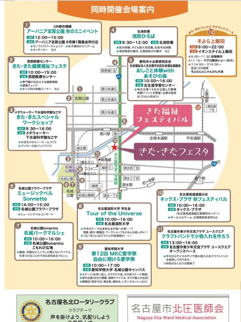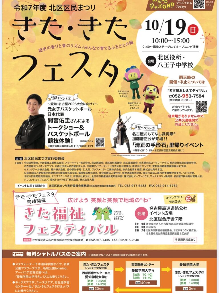 2025年9月13日 / 最終更新日時 : 2025年12月3日 anagoya_wp2 活動予定 / 報告 きた・きたフェスタ(北区民まつり) ちょっと早いですが、10月19日は「きた・きたフェスタ(北区民まつり)」です! 私はあちこちの会場にいます。 当日は他でも大きなイベントがあるようですが、是非、北区民まつりへお立ち寄りくださいませ。