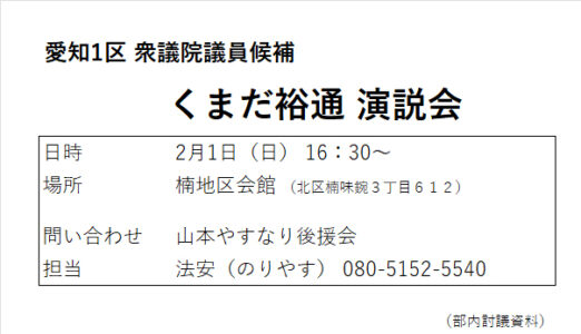 2026年1月28日 / 最終更新日時 : 2026年1月31日 anagoya_wp2 活動予定 / 報告 片山さつき財務大臣 応援演説 片山さつき財務大臣による積極財政による強い経済への回復、大変わかりやすい説明があり、「そのために必要な くまだ裕通 候補を、愛知1区の皆さんは、早々に衆議院議員として戻してください!」との熱弁が素晴らしかったです!